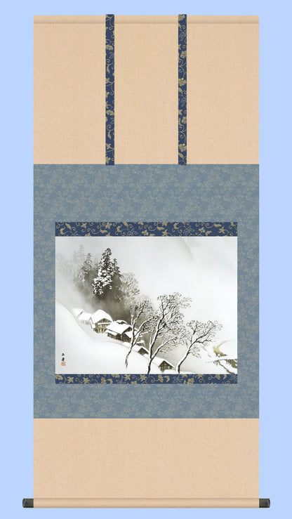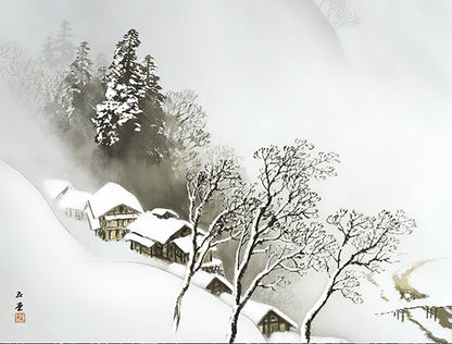 - 川合玉堂の《吹雪》は、冬の猛吹雪に包まれる山村の情景を描いた日本画です。強風にあおられてしなる木々、雪に覆われた家々が自然の厳しさを表現しつつ、そこに暮らす人々の静かな営みも感じさせる詩情豊かな作品です。