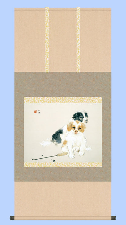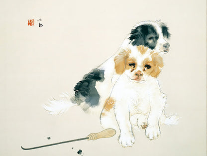- 火かき棒と炭の破片をさりげなく配置することで、炉辺の暖かさを表現しています。仔犬たちの満足そうな表情や仕草が愛らしく、見る人の心を和ませる作品です。栖鳳の繊細な筆使いと温かみのある色彩が特徴で、動物画の名手としての技術が存分に発揮されています。