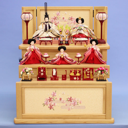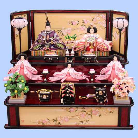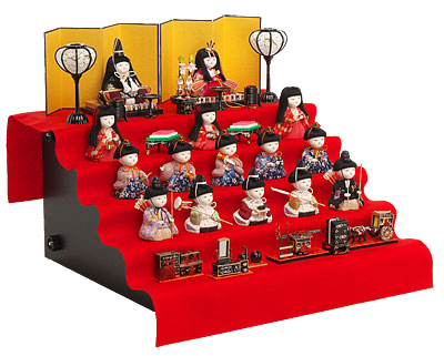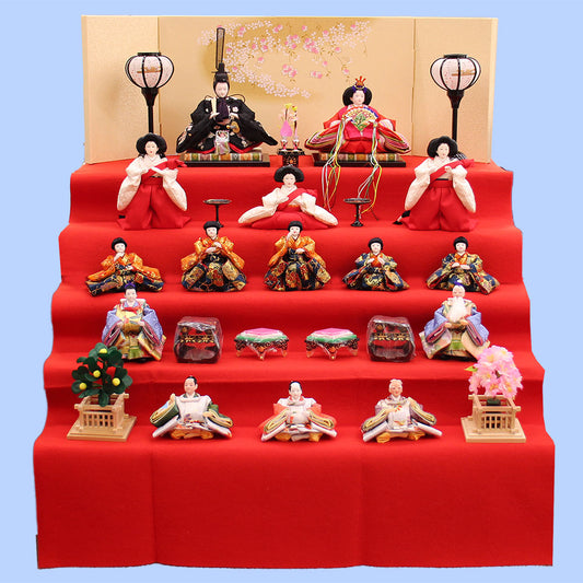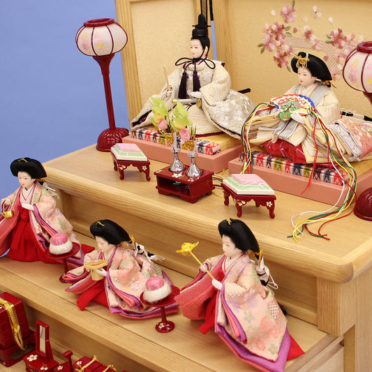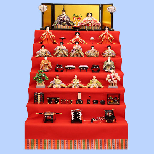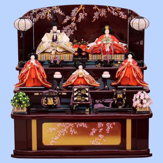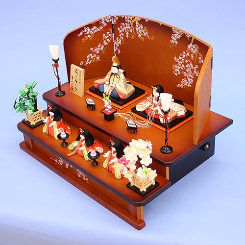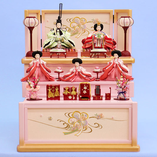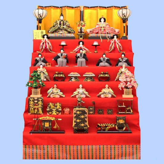 Five-tiered display <br>This tiered display can be arranged by adding 15 people (prince and princess, court ladies, five musicians, attendants, and servants), or by limiting it to five musicians, or by adding more props or dolls.