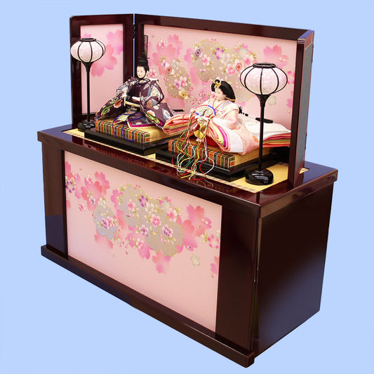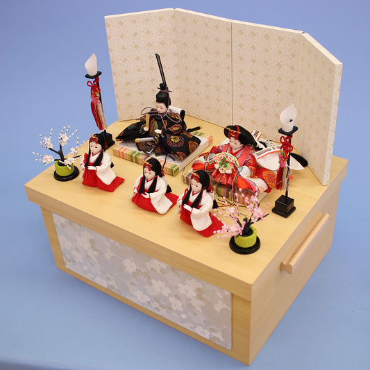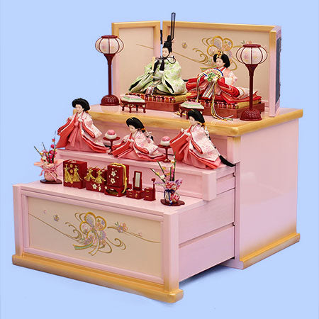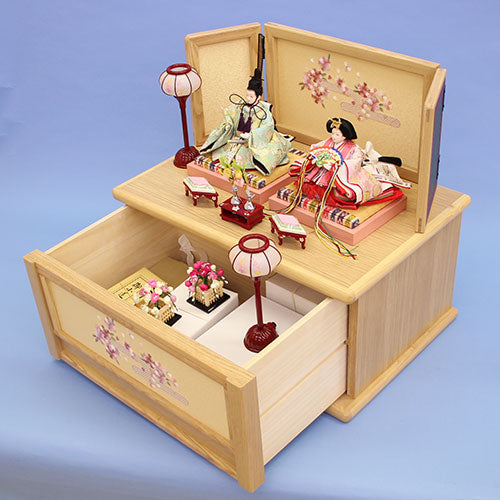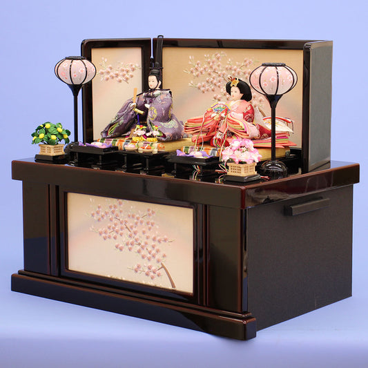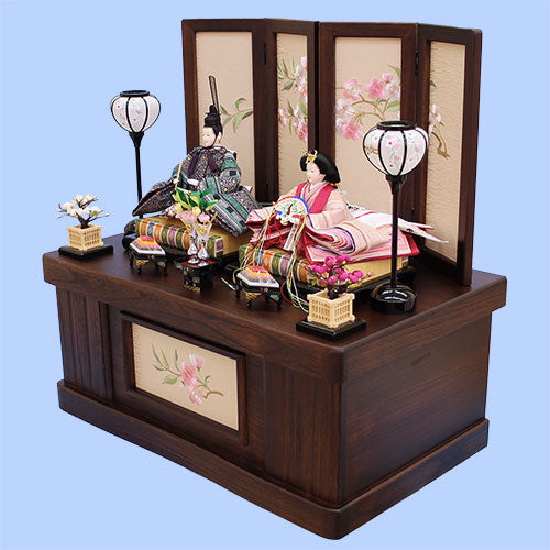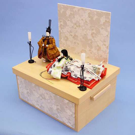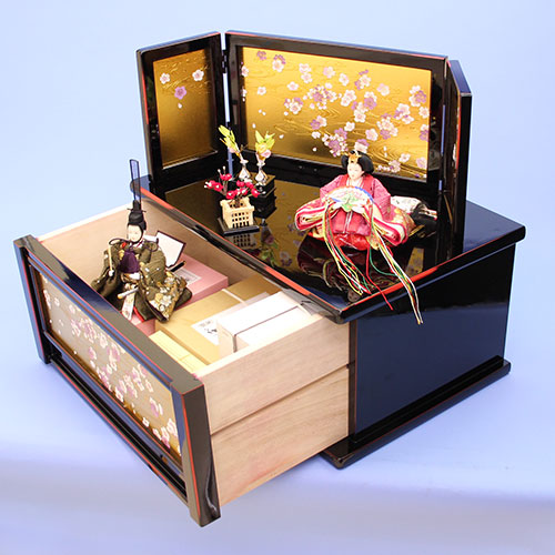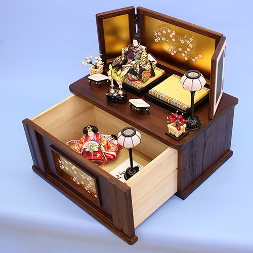 Storage display : A storage-type display with a storage box as the base. One-tiered display with an Emperor and Empress, and three-tiered display with five dolls. There are various types available, including drawers, folding doors, and lids.