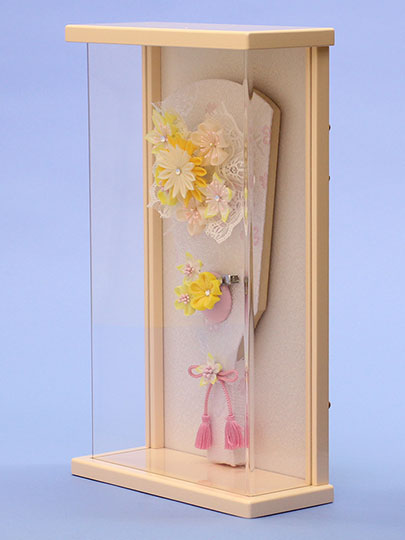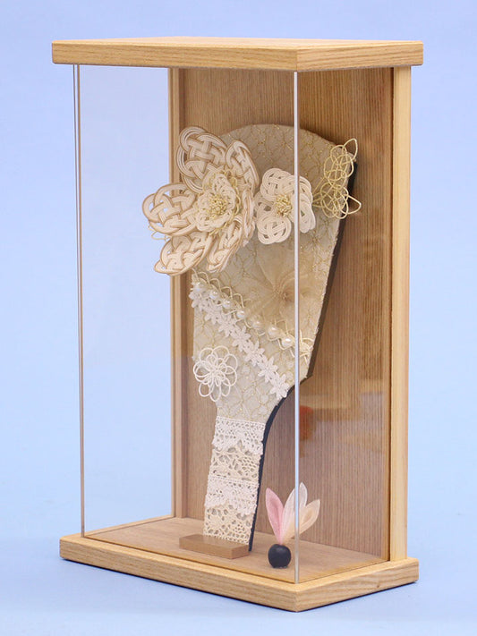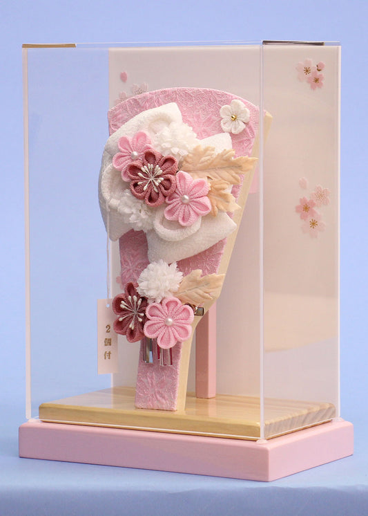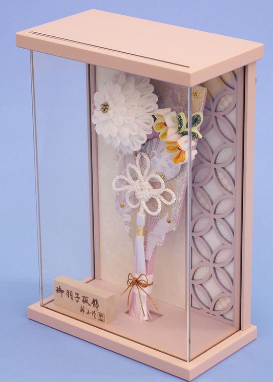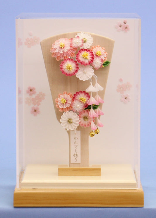 Hagoita with White Chirimen Ribbon Kanzashi | Mocha Pink Slim Acrylic Display Case