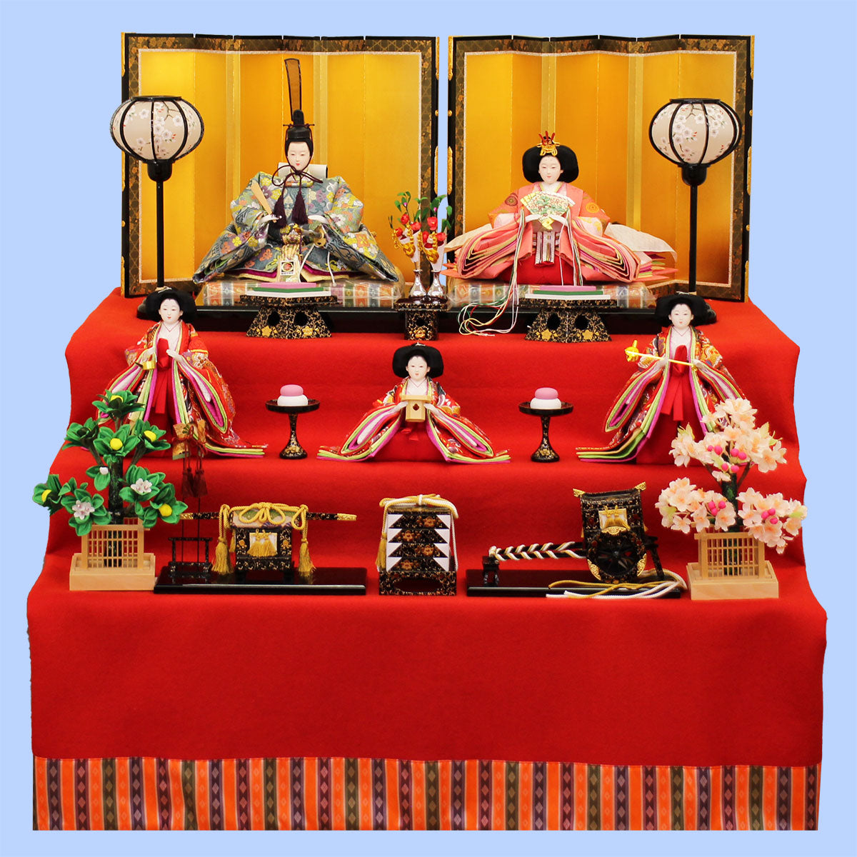 Three-tiered display of five Hina dolls. Supervised by Juho Dolls Tougei.