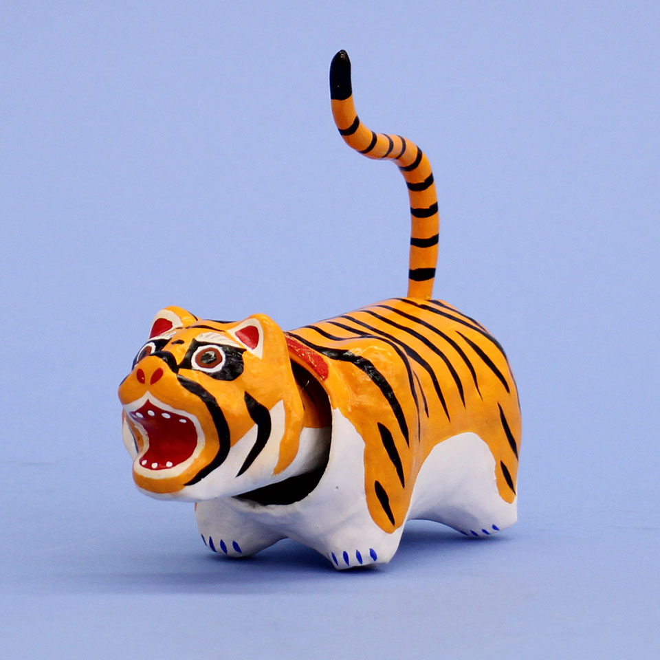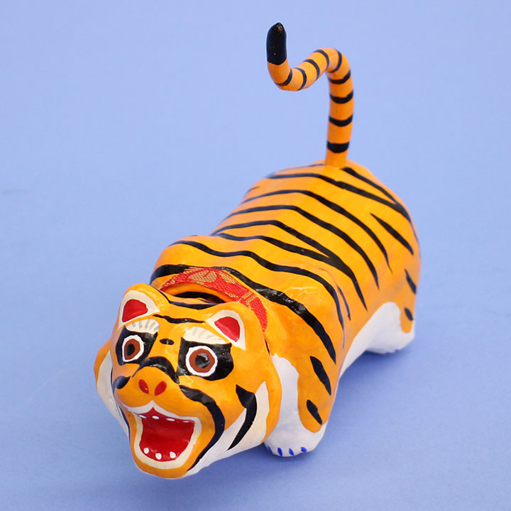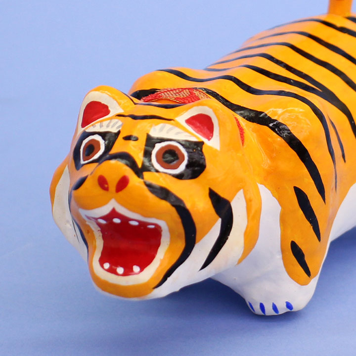 Il s'agit d'une décoration de tigre en papier mâché pour le festival des poupées de mai, proposée par un magasin spécialisé dans les poupées.