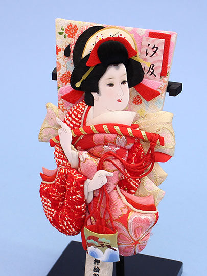 Décorations du Nouvel An pour le premier Nouvel An et le premier festival. Seules les décorations Hagoita et le Hagoita avec support sont vendus. Les étuis ne sont pas inclus. Dimensions (hauteur 26 cm avec support) : un Hagoita Shiokumi compact avec un adorable kimono furisode orné de kanoko et de brocart doré.