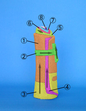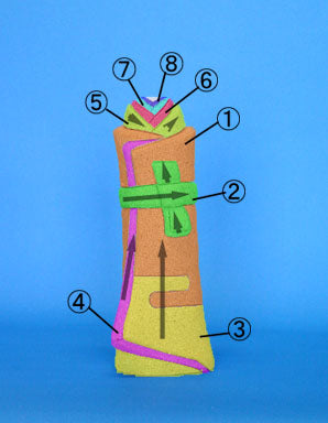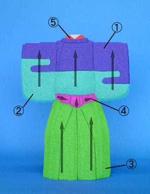 - Les numéros de 1 à 5 correspondent aux numéros du tissu. Le tissu du dessous est celui du hakama.