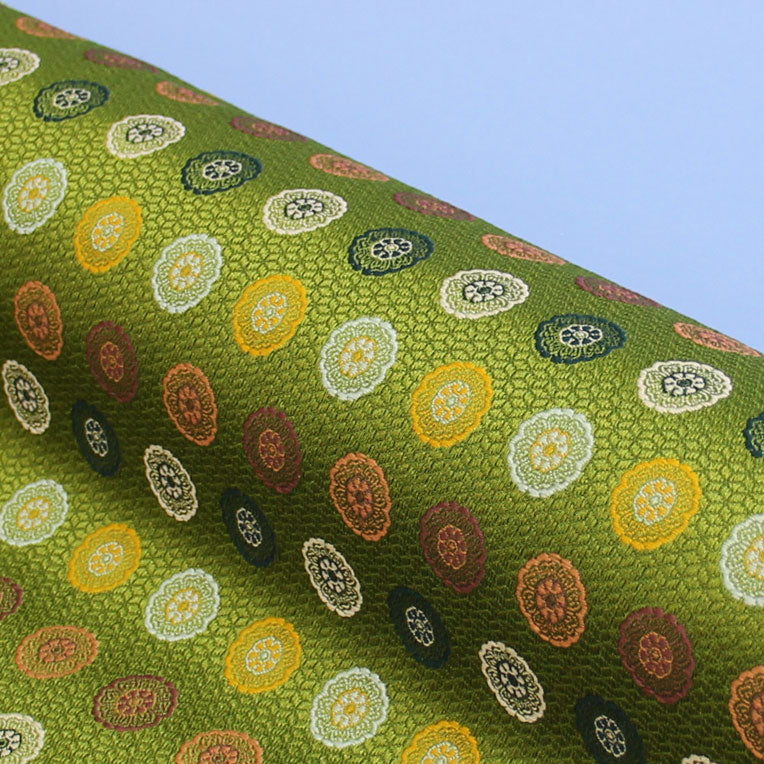 La photo montre des carrés de 8 cm et de 24 cm. Brocart de polyester vert, célèbre tissu Yusoku Marumon Rinpa. Épaisseur : moyenne.