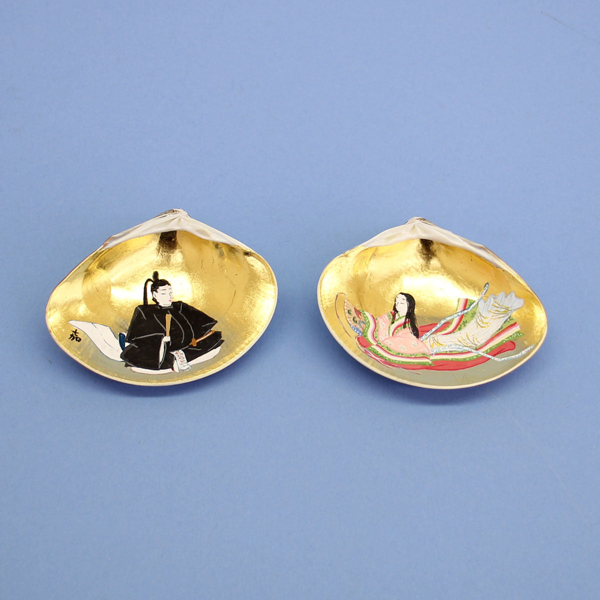 Poupées et accessoires Hina : une paire de kimonos à 12 couches de haute qualité, peints à la main et plaqués or, assortis aux coquillages