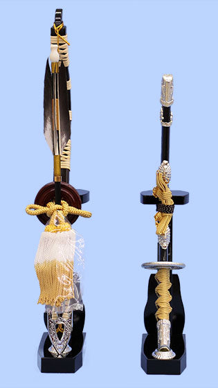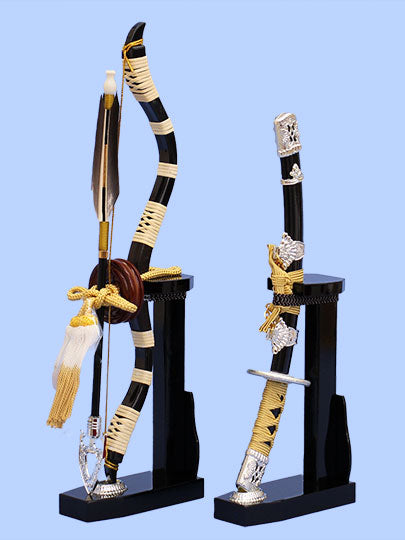 - Le support est en boise, l'arc est enveloppé de rotin et l'épée est fixée au support. Elle ne peut être retirée.