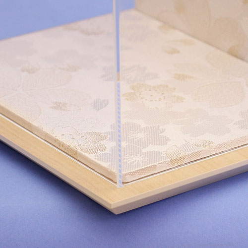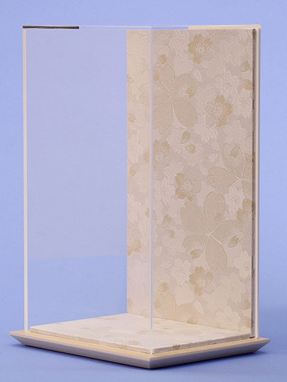 Coffret pour les décorations Hagoita du premier Nouvel An et de la première fête. Dimensions intérieures (l 16 x p 12 x h 24) et extérieures (l 19 x p 15 x h 26,5). Le coffret est orné de brocart blanc à fleurs de cerisier sur la base et le dos, mettant en valeur les décorations intérieures (couvercle en acrylique).