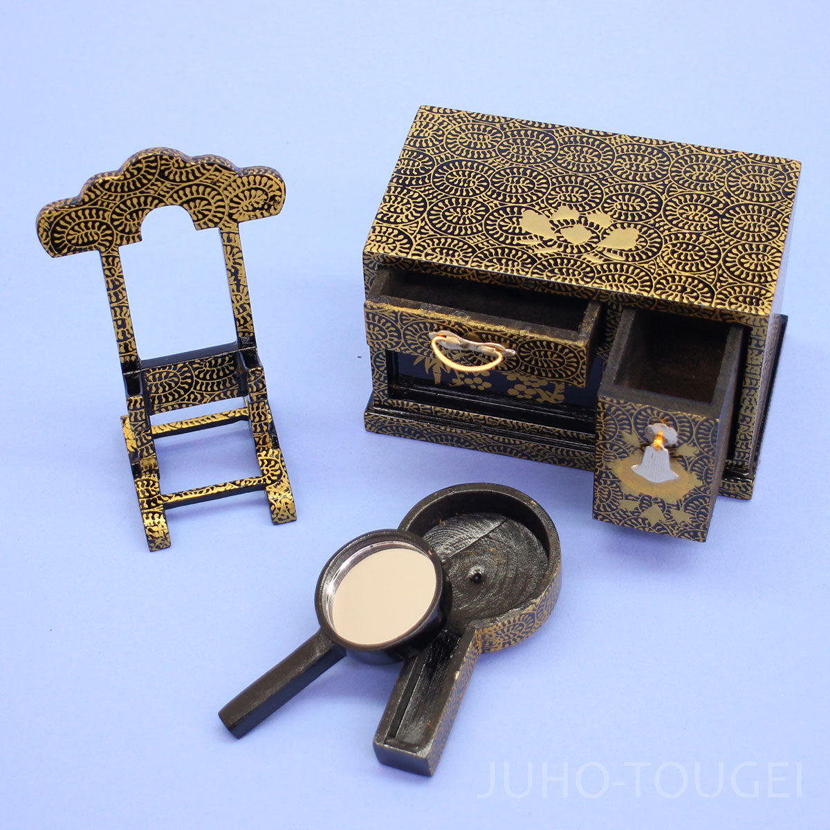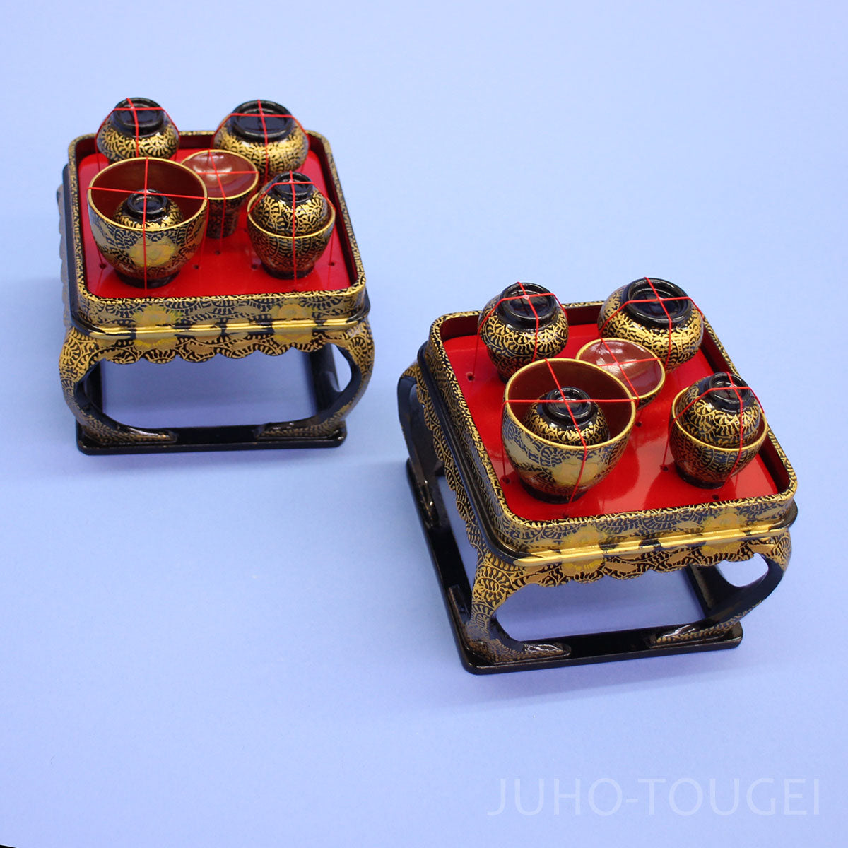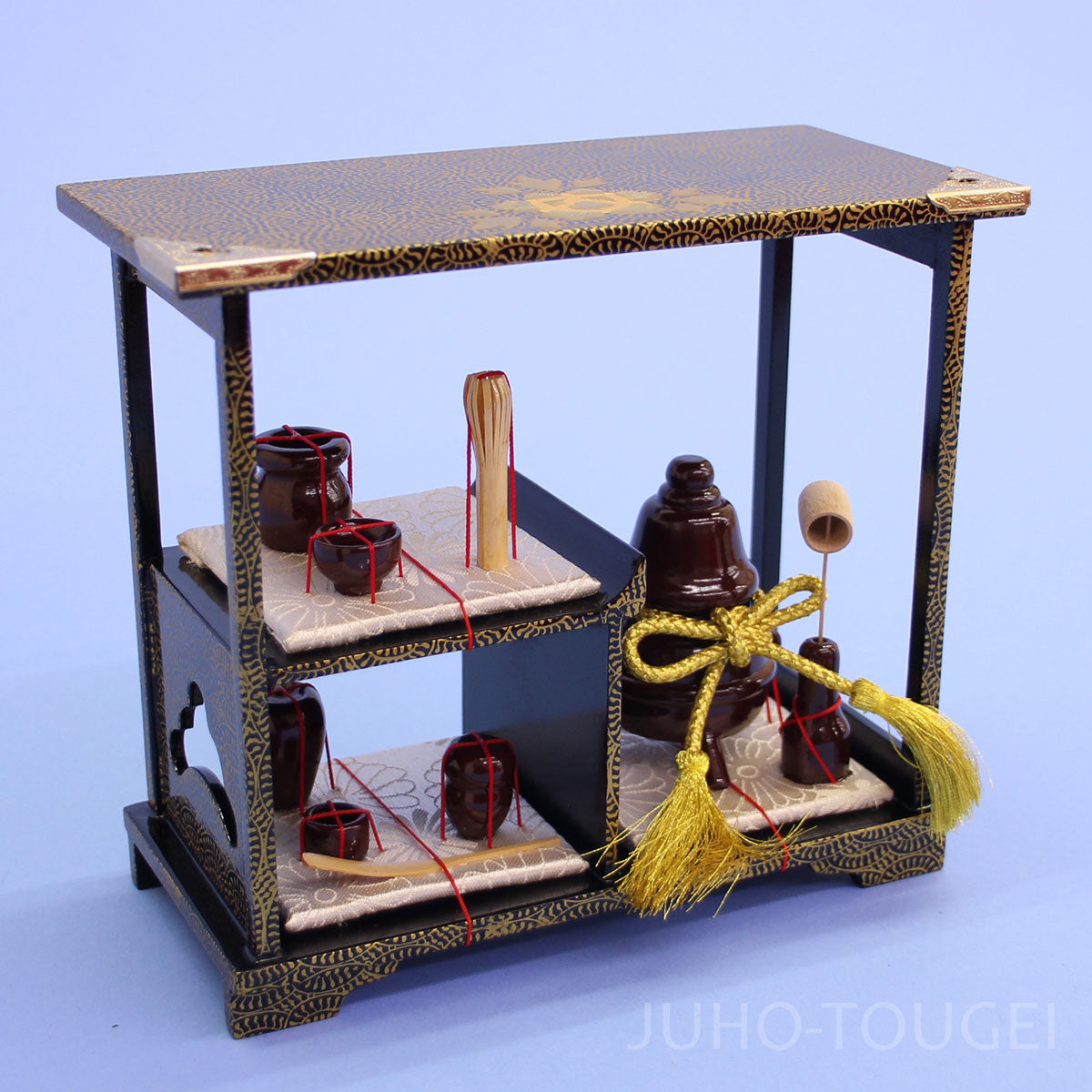 • L'ensemble complet comprend un trépied en forme de losange, un ensemble complet de plateaux de salle à manger, un ensemble complet de trois paires de miroirs, un brasero, des ustensiles à thé, un chariot, un panier et une boîte à bento.