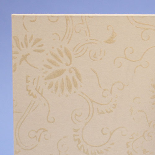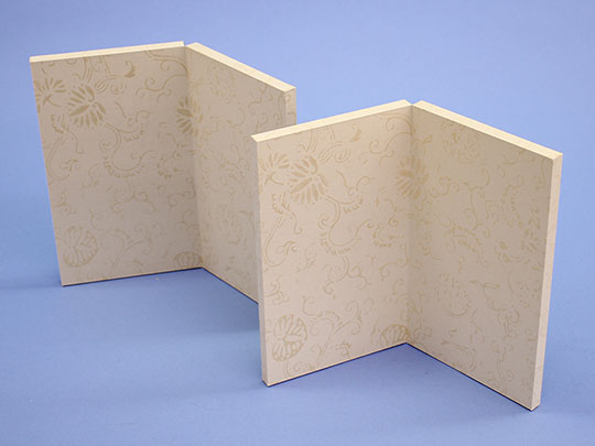 • Un paravent compact avec un motif d'arabesques de roses trémières réalisé avec du papier karakami de Kyoto pour les poupées Hina.