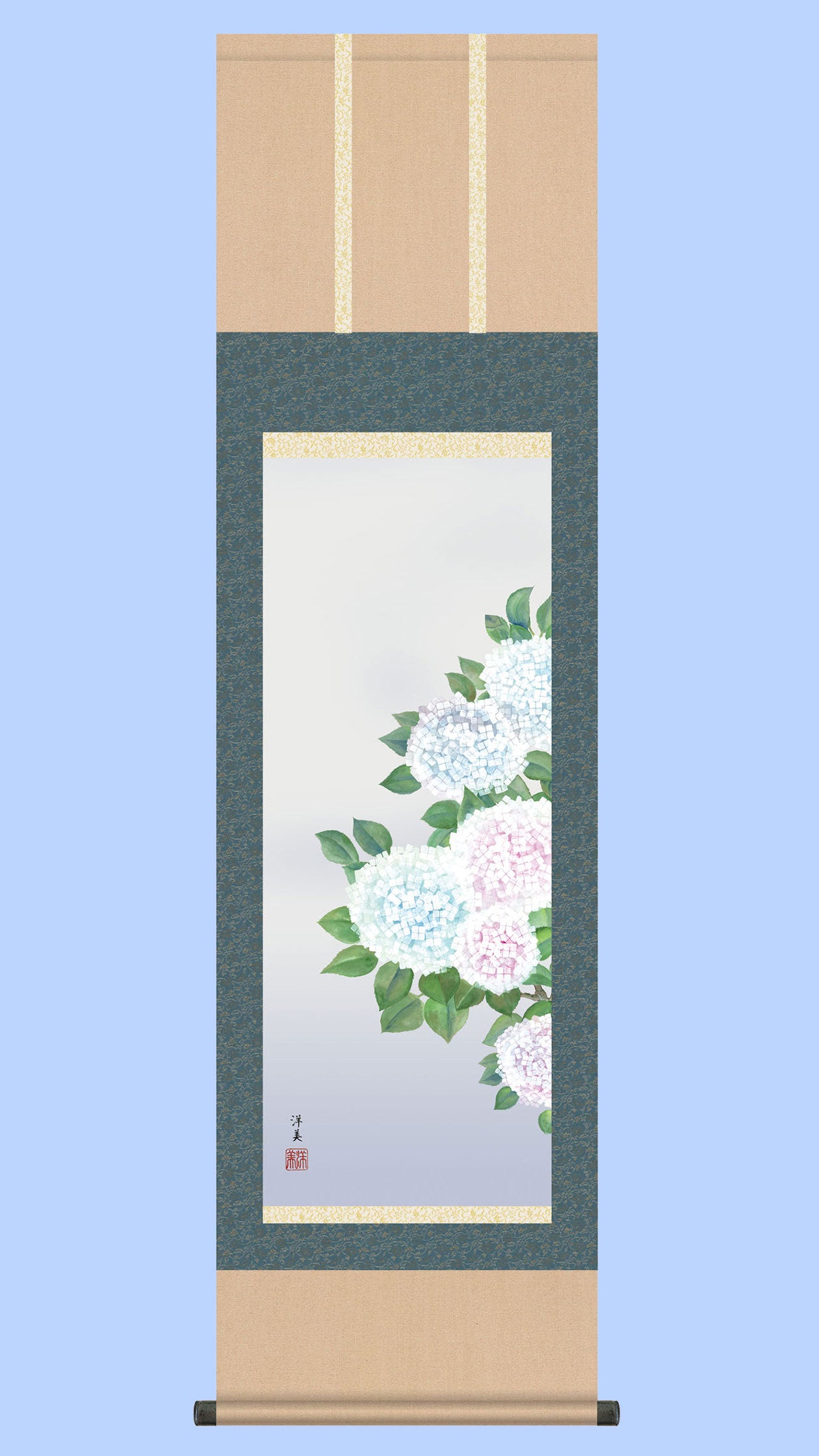 Peinture de fleurs et d'oiseaux, rouleau suspendu d'hortensia par Hiromi Uemura