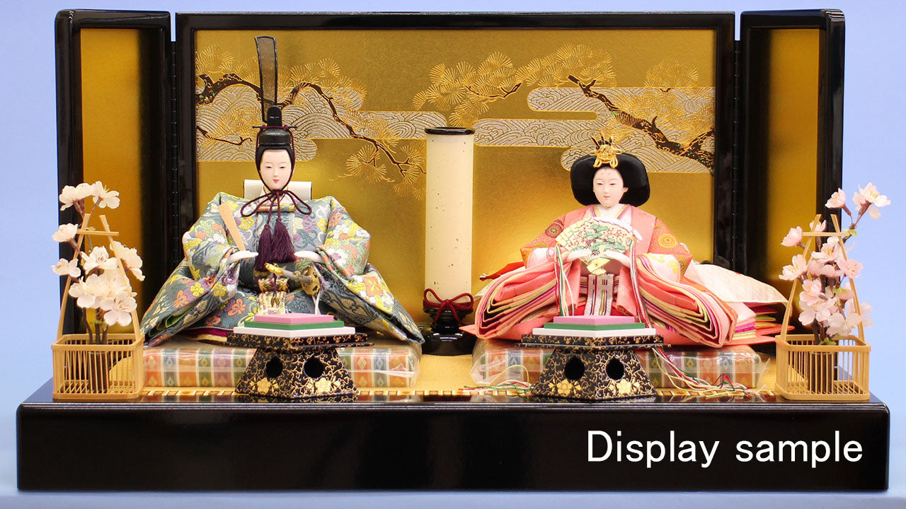 お雛様(二人の親王飾り)を飾るための、台、屏風セット。お人形を飾った見本の写真は、通常90㎝から105㎝の台で飾る京九番親王(十番親王とほぼ同等殿さまの袖から袖の幅が約30cm)のリサイズイメージです。親王台の黒い枠と、雪洞を飾らないことで、横幅と高さをおさえ、通常より狭いこの80cmの台でバランスよくおさめました。