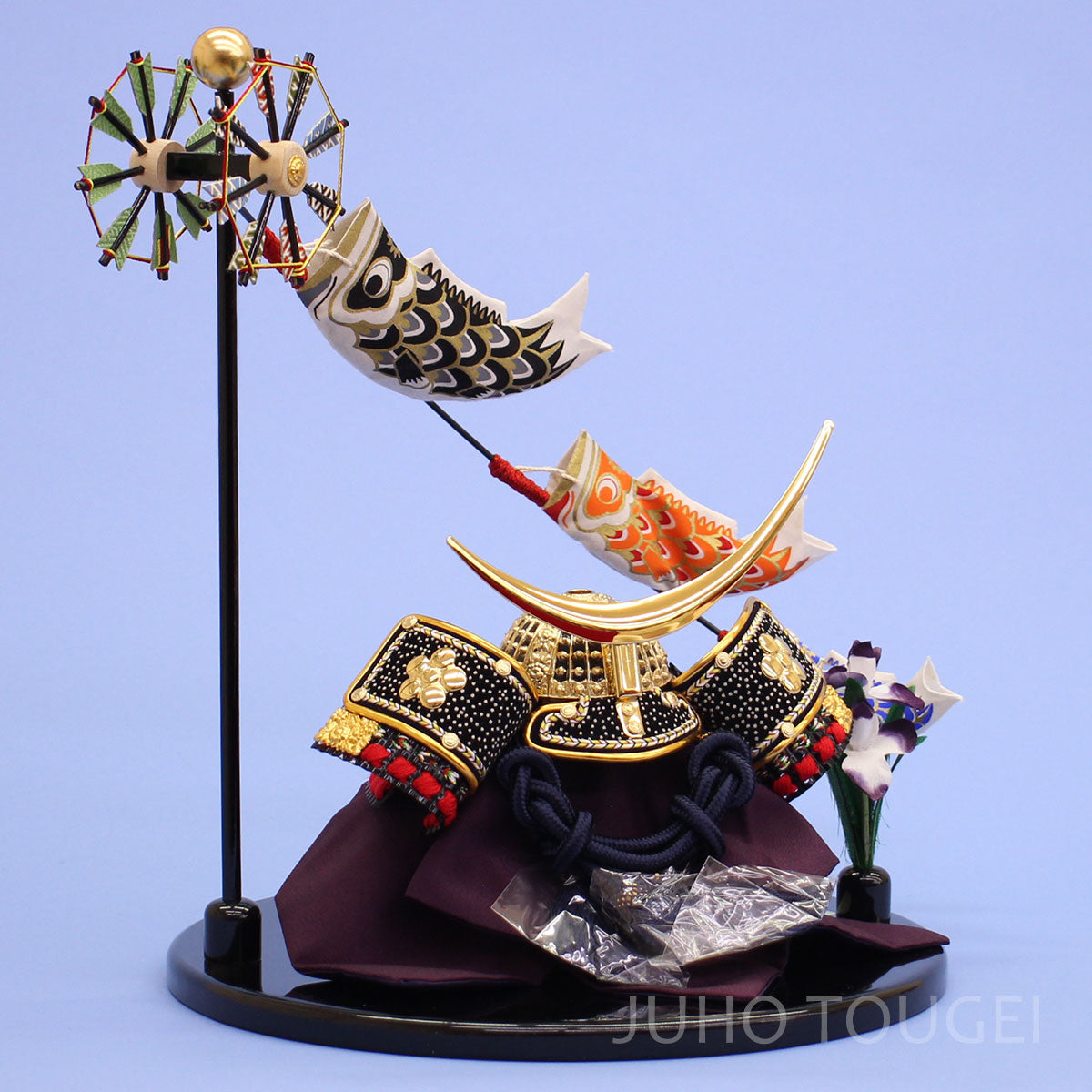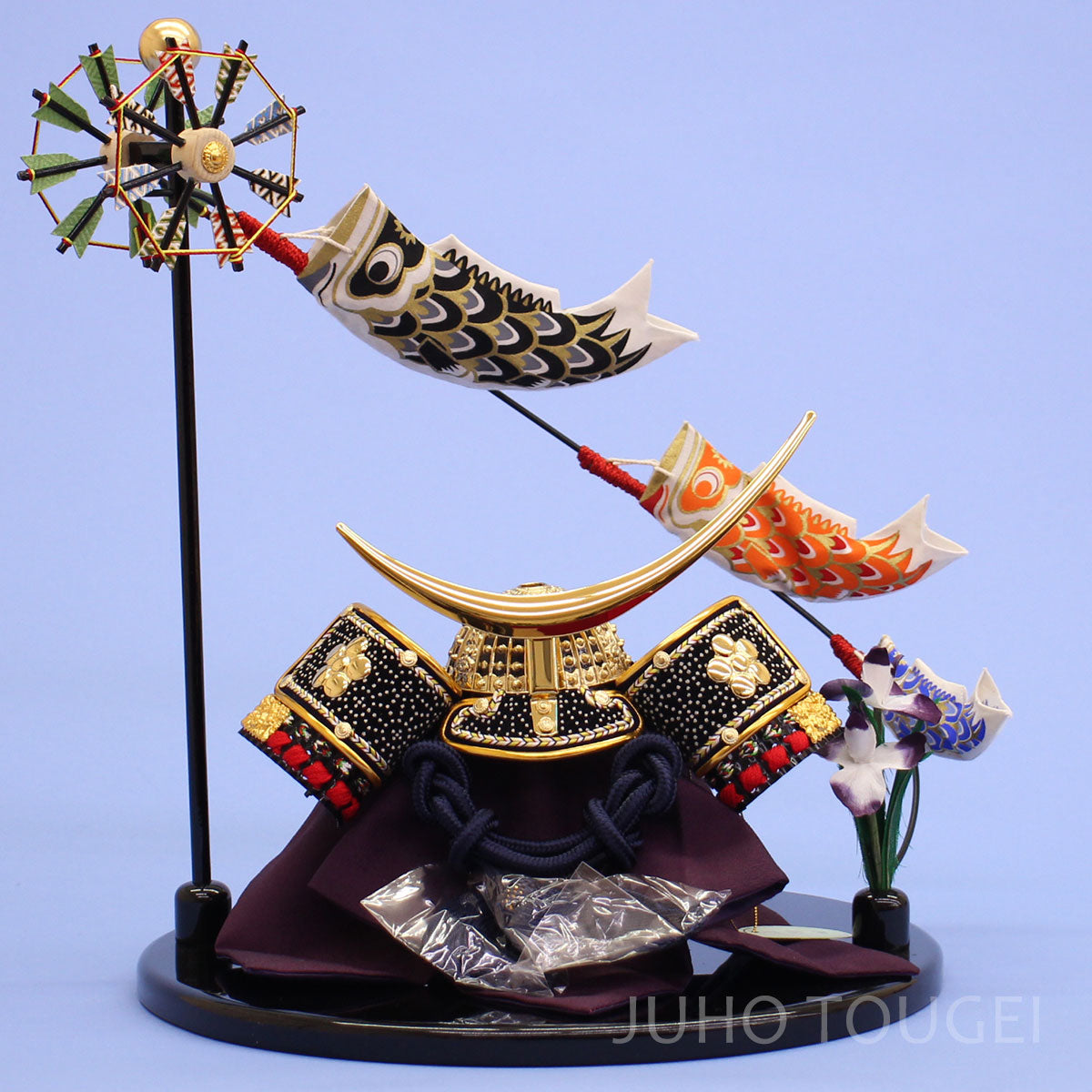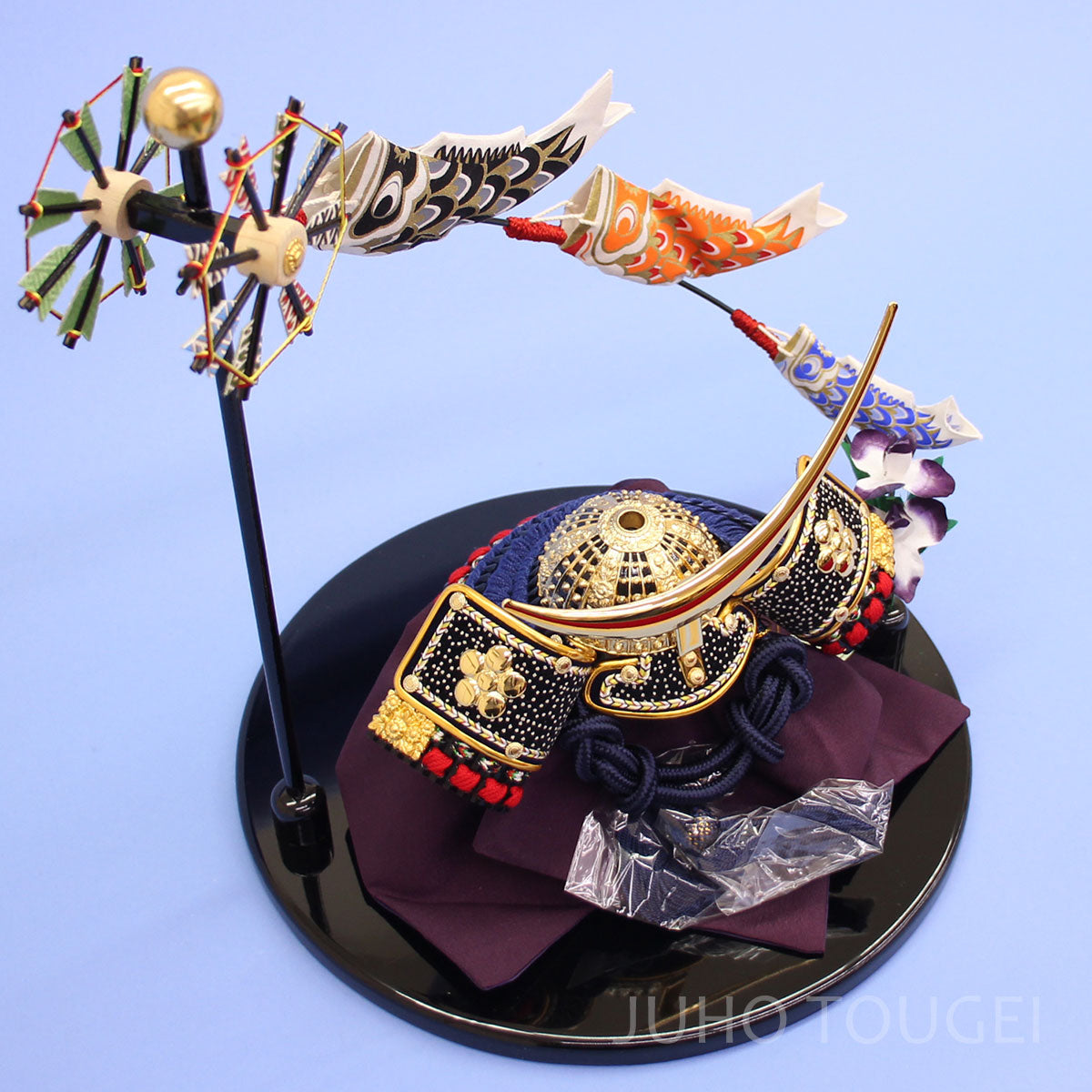 • こいのぼりのついた丸台飾りに、伊達政宗兜を組み合わせました。