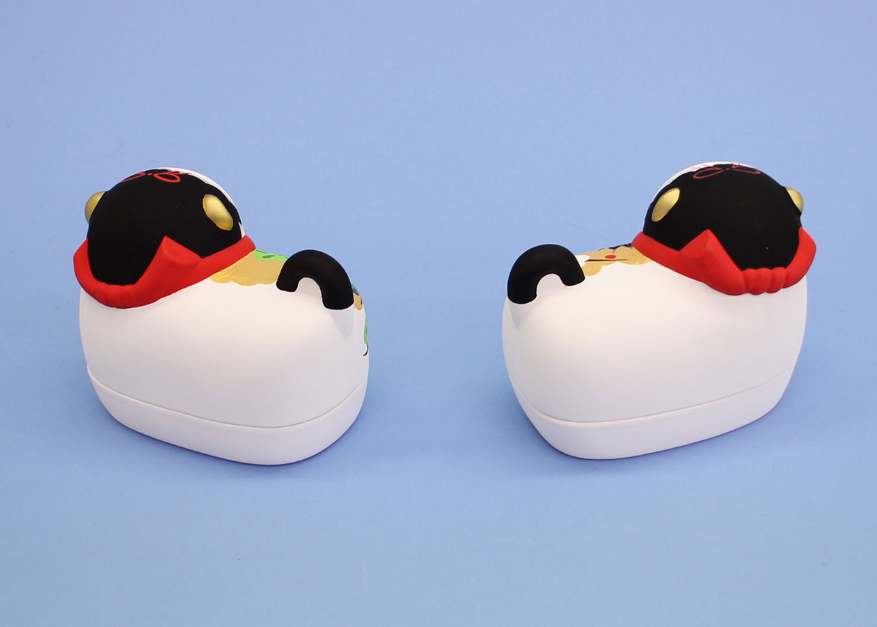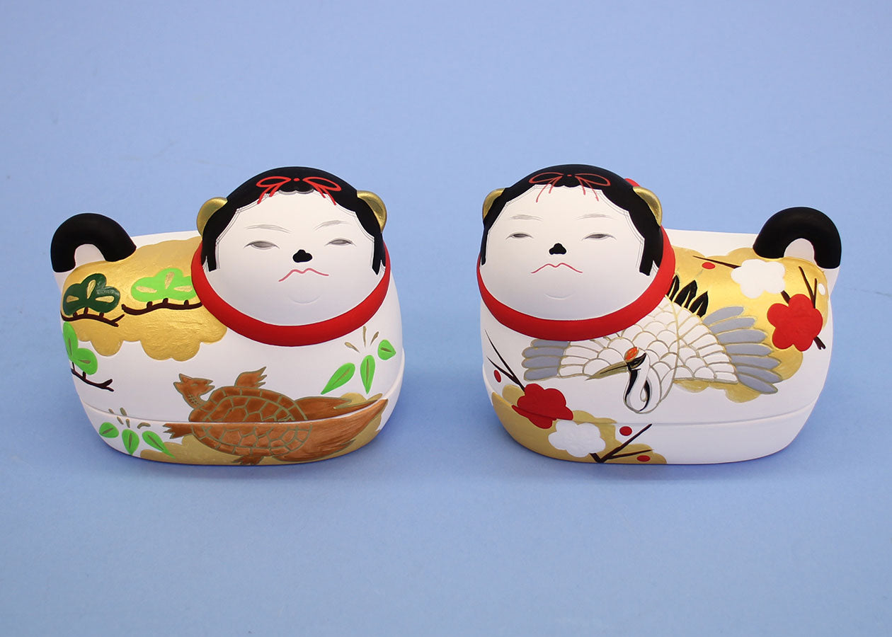 昔は左向き(向って右)が雄犬で安産のお守りを納め、右向き(向って左)が雌犬で白粉は玩具が納められておりました。 現在ではご結婚のお祝いや初節句などに個性的なお祝いとしてご利用頂いております。