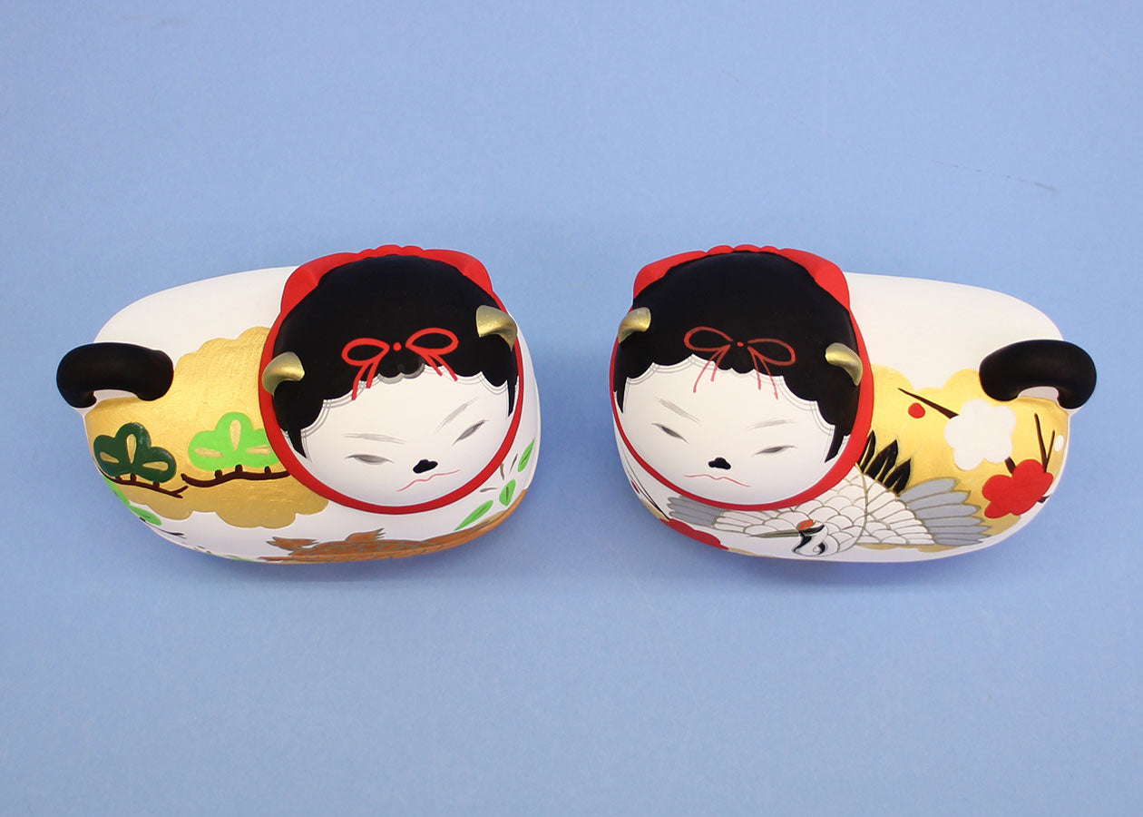 幼子の顔を模した雌雄一対の犬の形の小箱で、犬は安産・多産の象徴であり子犬は丈夫に良く育つことから安産と幼児の無病息災を祈るお守りとして飾られました。