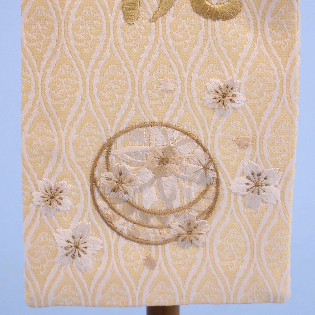 • つるし雛のメーカーさんが作る、淡いベージュの金襴に人気のまり柄の刺繍が繊細でかわいらしい名前旗です。