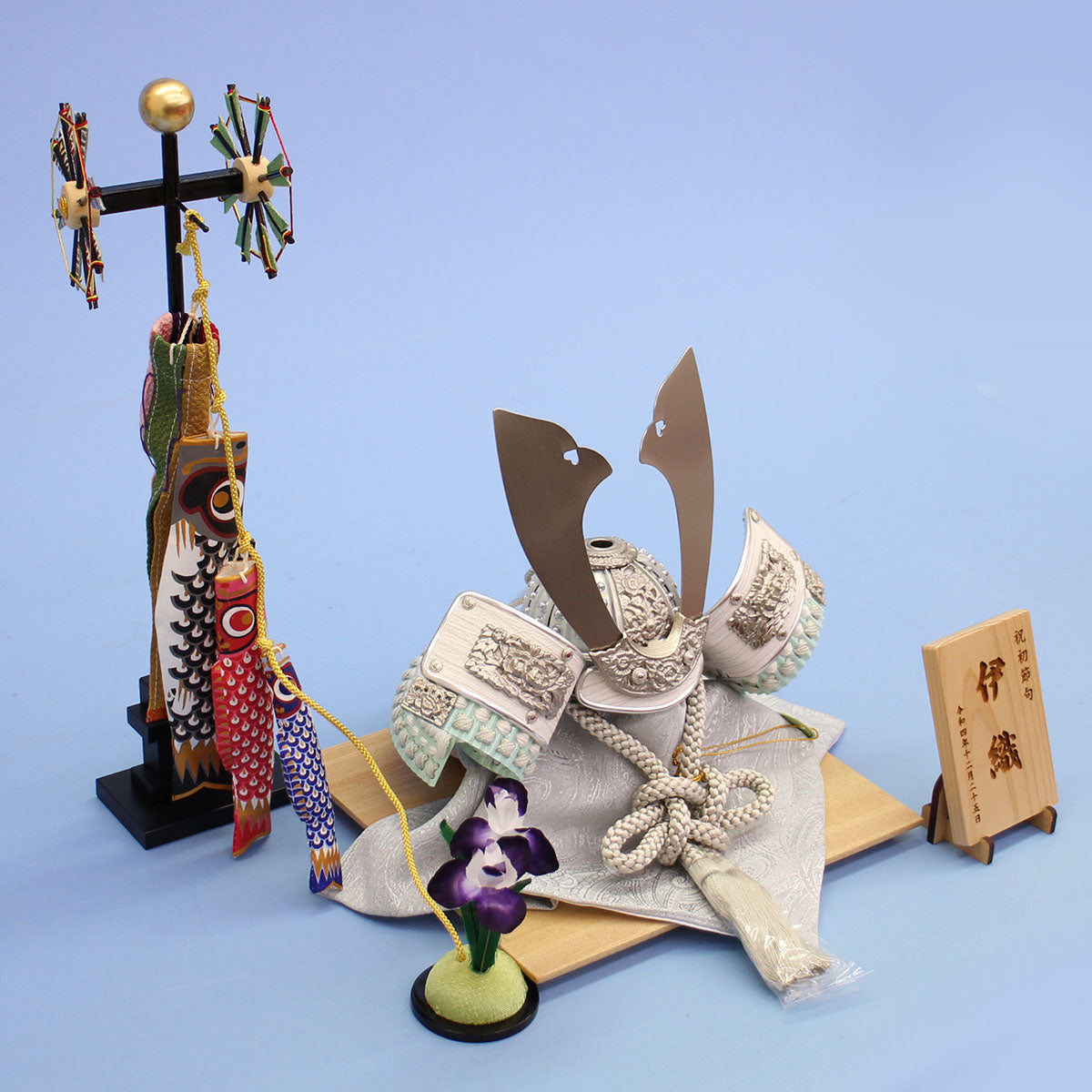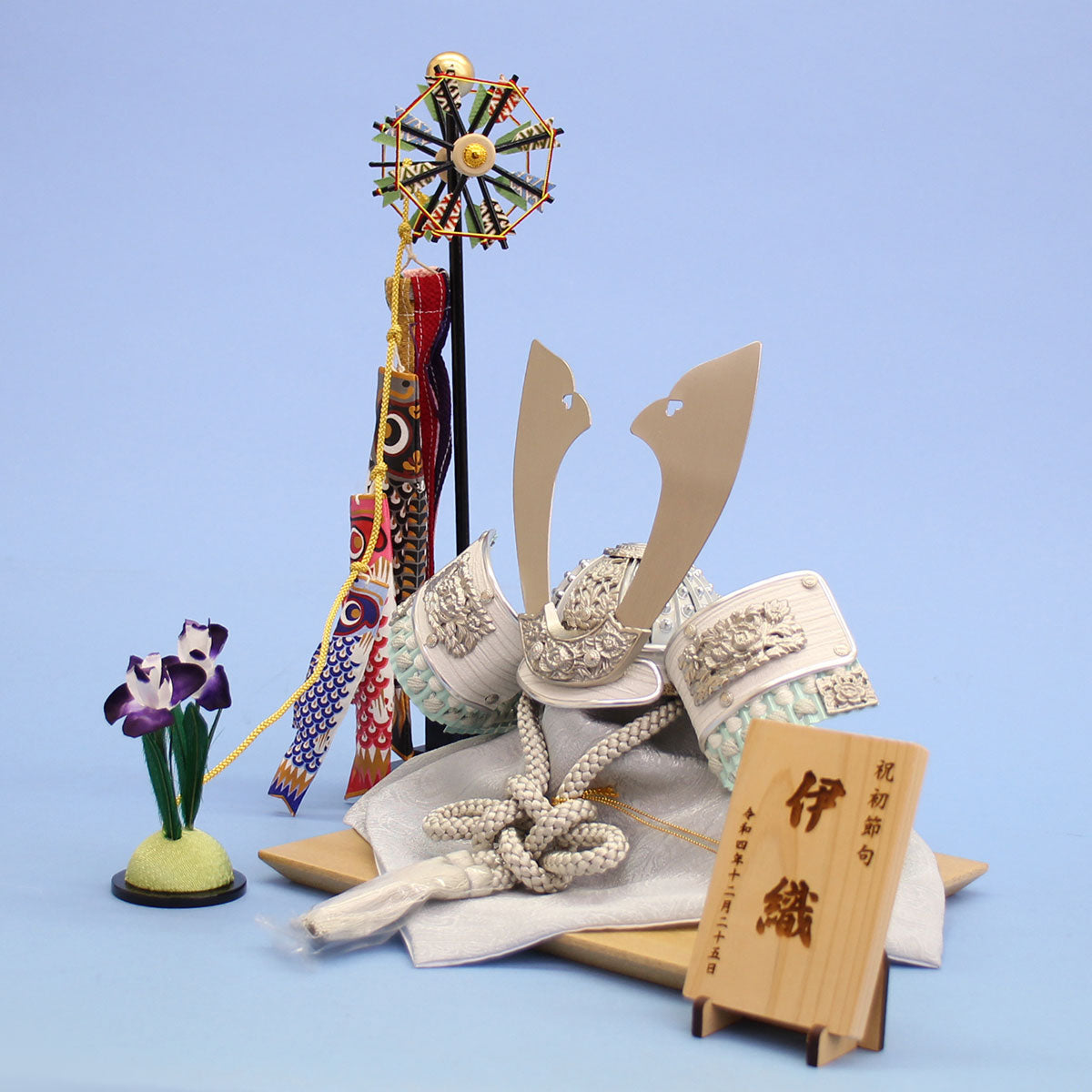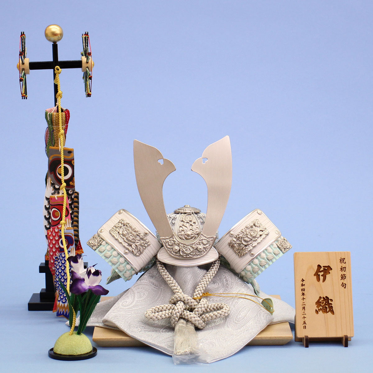 - 木目調の突板台とこいのぼりの組み合わせに、白系の兜を組み合わせました。名札にはお子さんのお名前を名前をレーザー彫刻致します