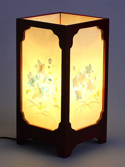 盆提灯高さ35cm 径17.5cm外箱サイズ:19x19x36下台:圧縮合板 ワインカラー 回転灯付き小さな行灯なので棚の上に置くのにおすすめです。4面すべてに絵付けしてあるので壁を気にせずかざれます
