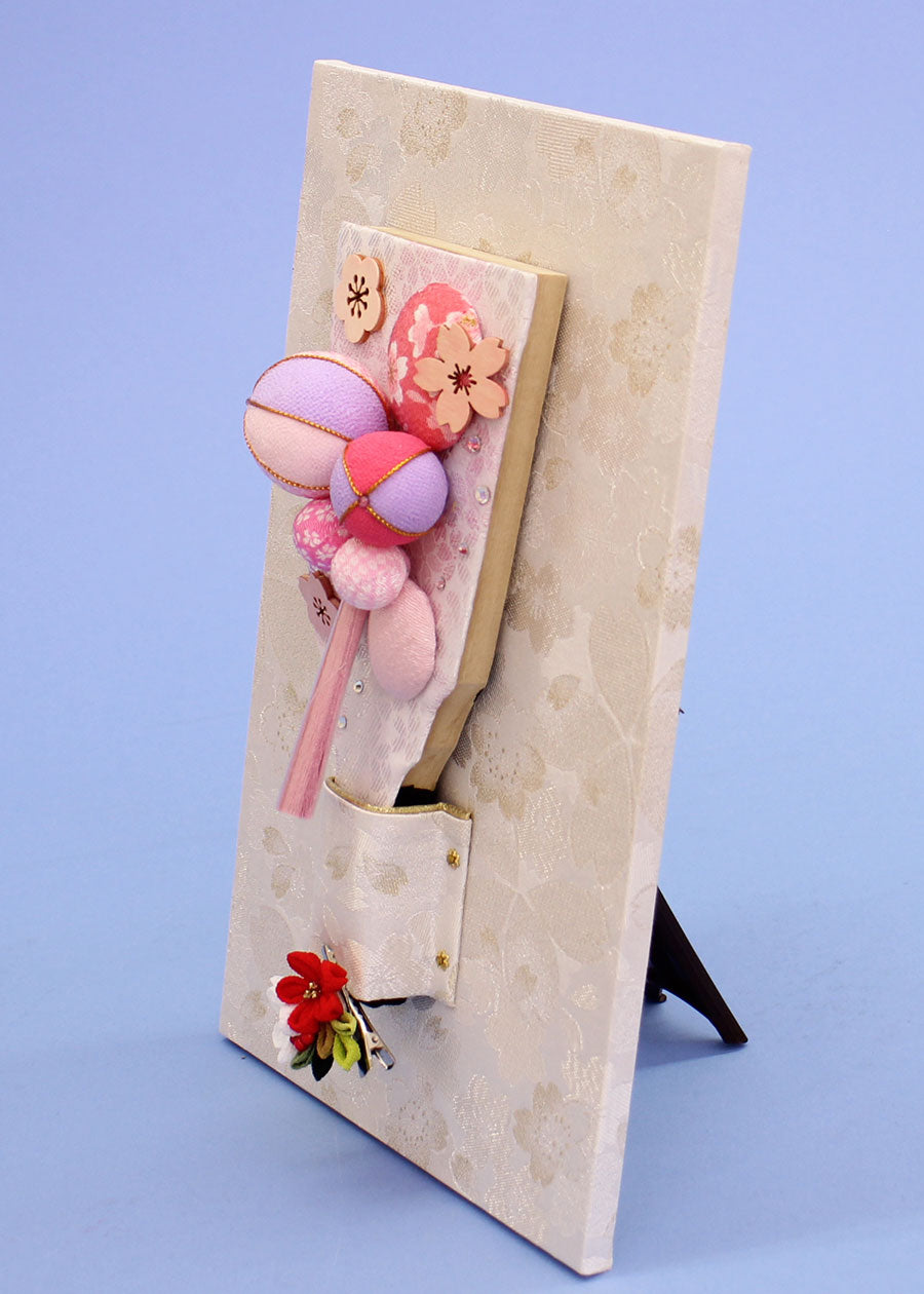 • 可愛い白ベースの木目込みまりがかわいい壁掛け羽子板。スタンドについた小さなクリップの髪飾りを取り外してご利用いただけます。