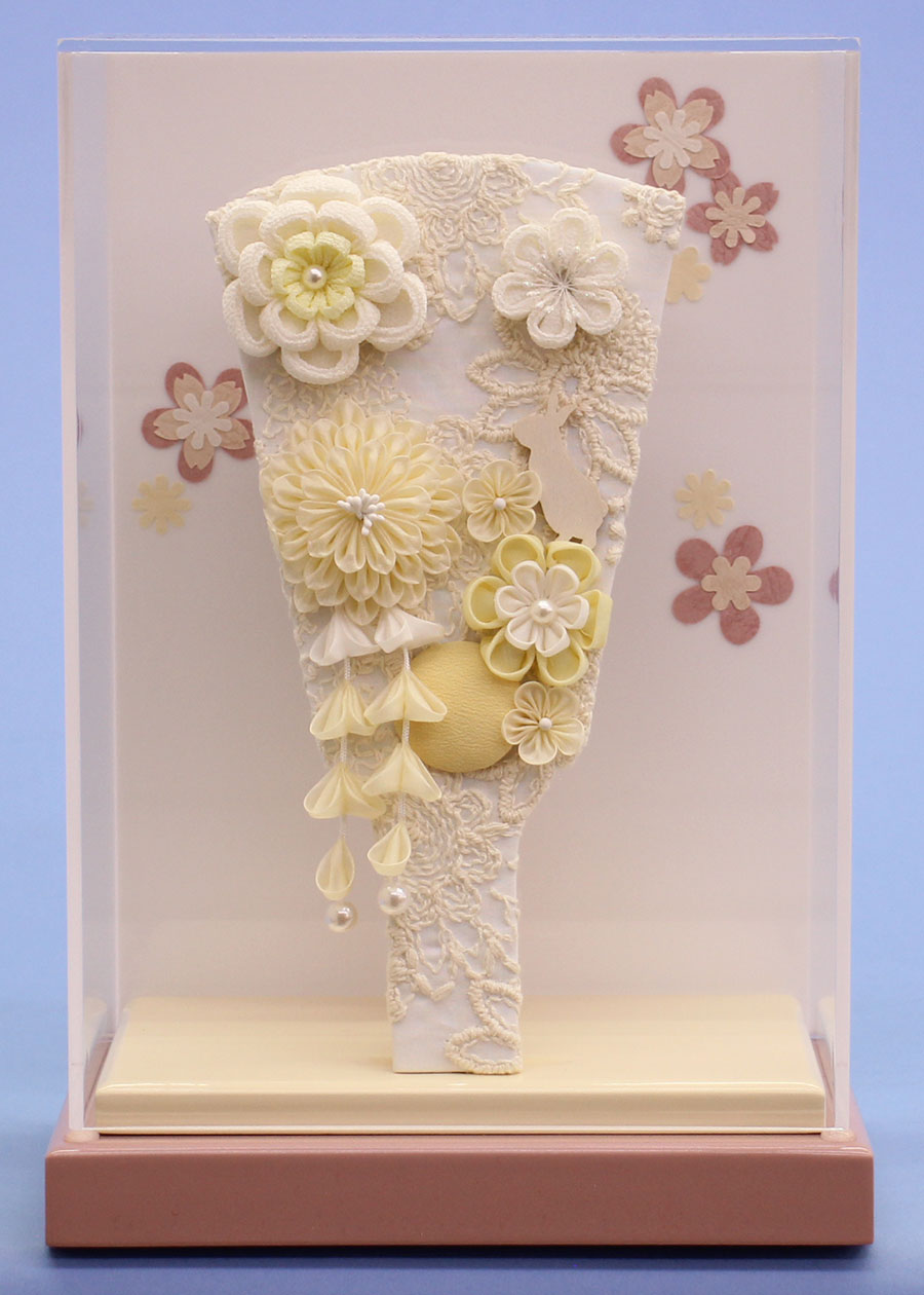 • 白いつまみ細工の羽子板を。薄型くすみピンクのアクリルケースに組みました