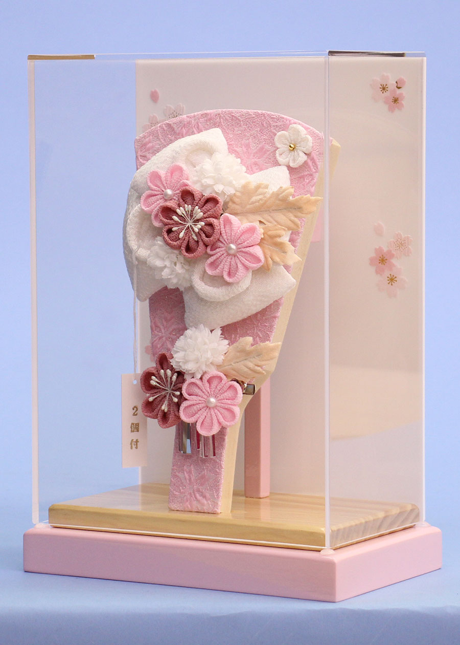 • ピンク地に白いリボンがかわいいかんざしが外せる羽子板を。薄型のピンクのアクリルケースに組みました