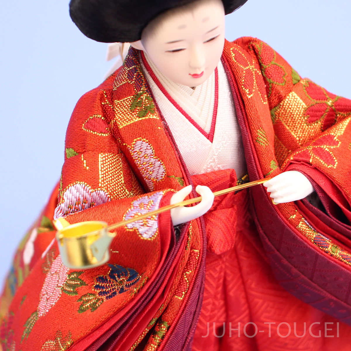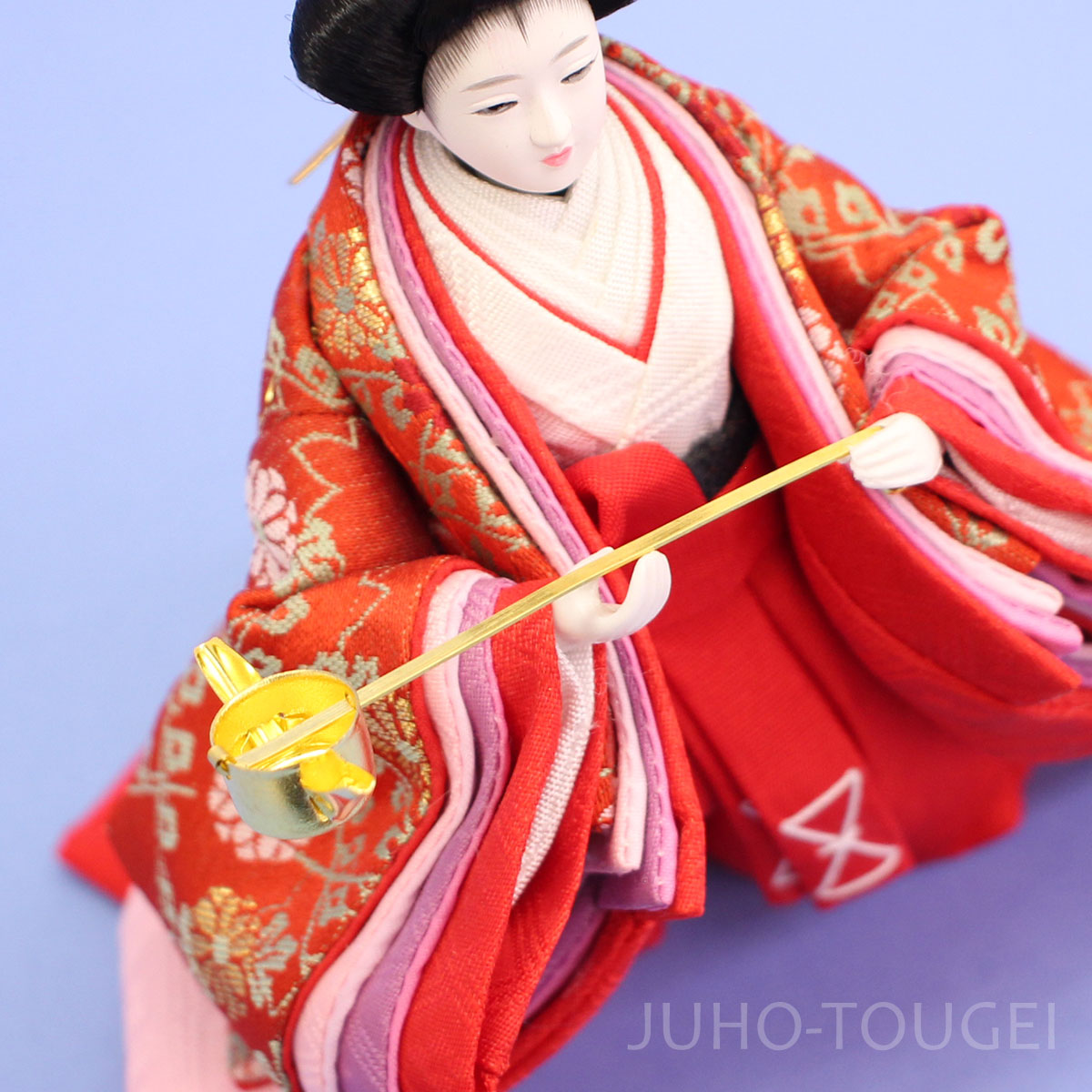 この持ち物を使用しているお人形の写真は柳サイズ。前半の立っている官女の高さが約16㎝、後半の立っている官女の高さが約11㎝ですが、どちらも違和感なく飾れています。