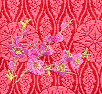 • 地模様の金襴に刺繍の桃が可愛らしい。