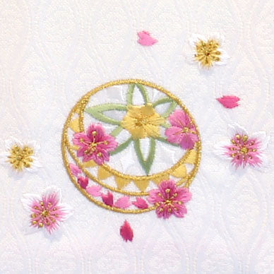 • 地模様の金襴に刺繍のホワイトまりが豪華です。