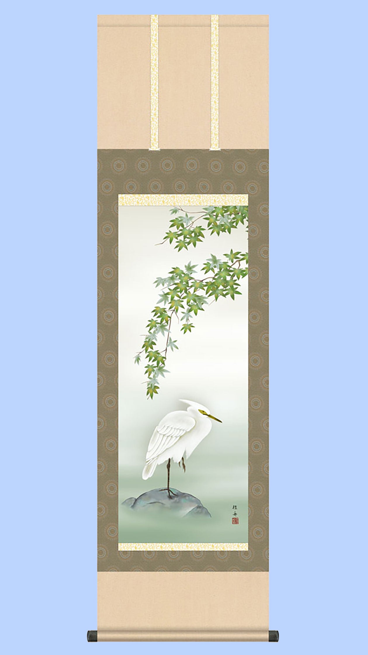 - 青々と茂る楓の葉陰で、夏羽の冠毛をたなびかせた純白のコサギが静かに佇む一幅。涼やかな緑と白の対比が、初夏の清々しさと上品な静けさを床の間に届けます。