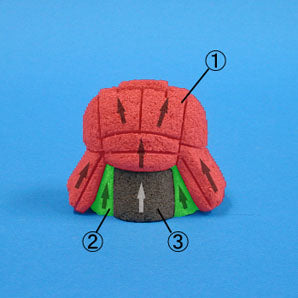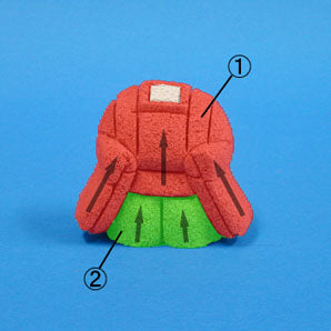 番号は布の番号です。底布は袴の布になります。このほかに靴と首と底のちりめんがつきます。矢印は布を貼るときの布の向きです。①の衣装は左右で異なります。その他は一緒です。弓は左手、矢(一本)は右手。矢(三本)は背中にボンドで貼り付けます。帽子の向きは写真のとおりです。帽子の下と首の下にボンドをつけ固定します。そのときボンドを付けすぎないよう注意してください。