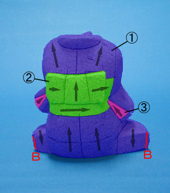 - Bの溝の所でつまんでしわをけします。切り込みは溝の途中までにしてください。
