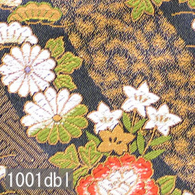 お写真は8cm角と24cm角。ポリエステル金襴紺系 松、菊、桔梗、牡丹柄 洛レイ胴入 厚さ:厚手