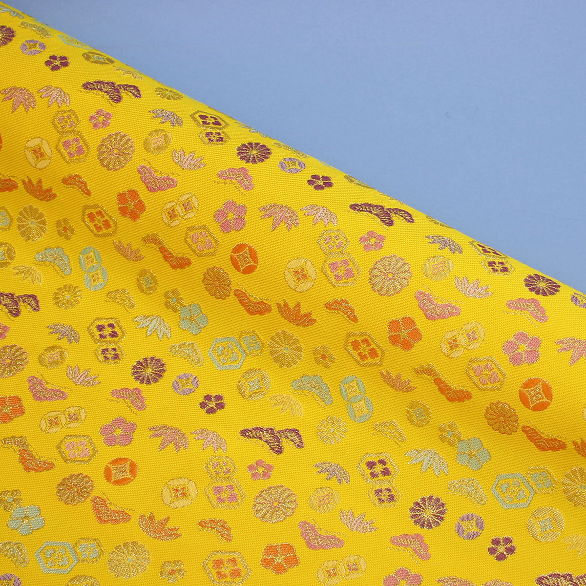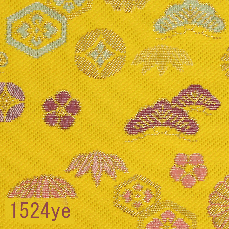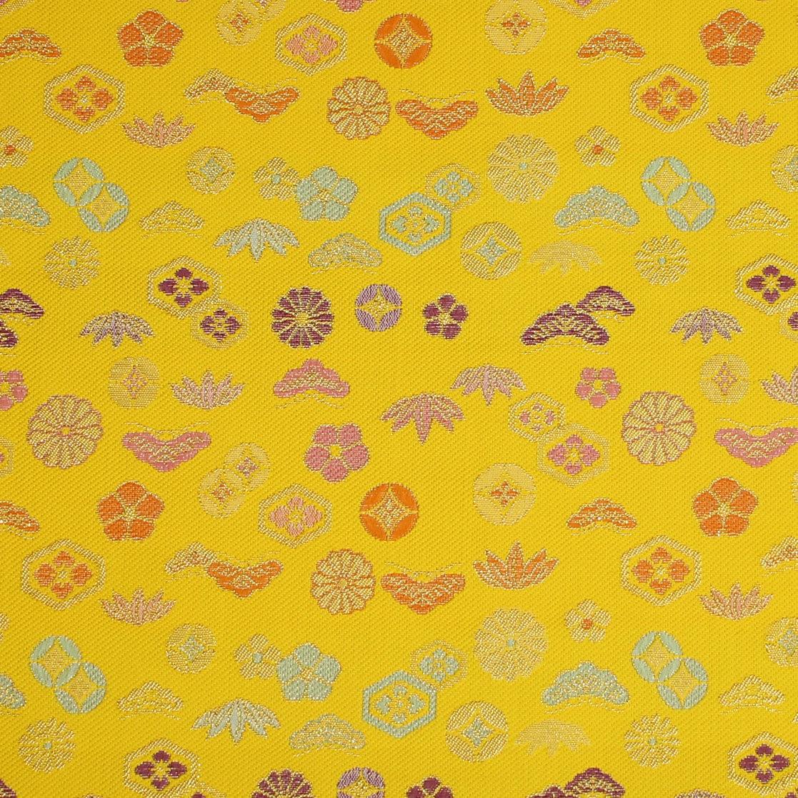 お写真は8cm角と24cm角。ポリエステル金襴 佐賀二丁別口 黄色系 松竹梅、七宝他柄 厚さ:薄手