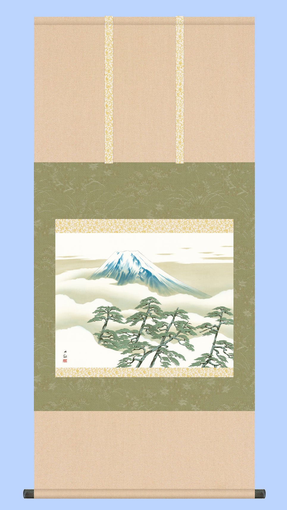 • 横山大観の「松に富士」は、手前に力強く立つ松と、奥に雲海から姿を現す雄大な富士山を描いた作品です。日本の自然の美と精神性を象徴し、静けさと荘厳さを併せ持つ、大観の代表的な富士山画のひとつです。