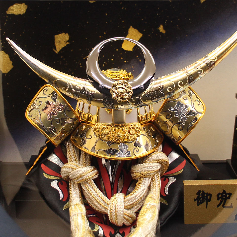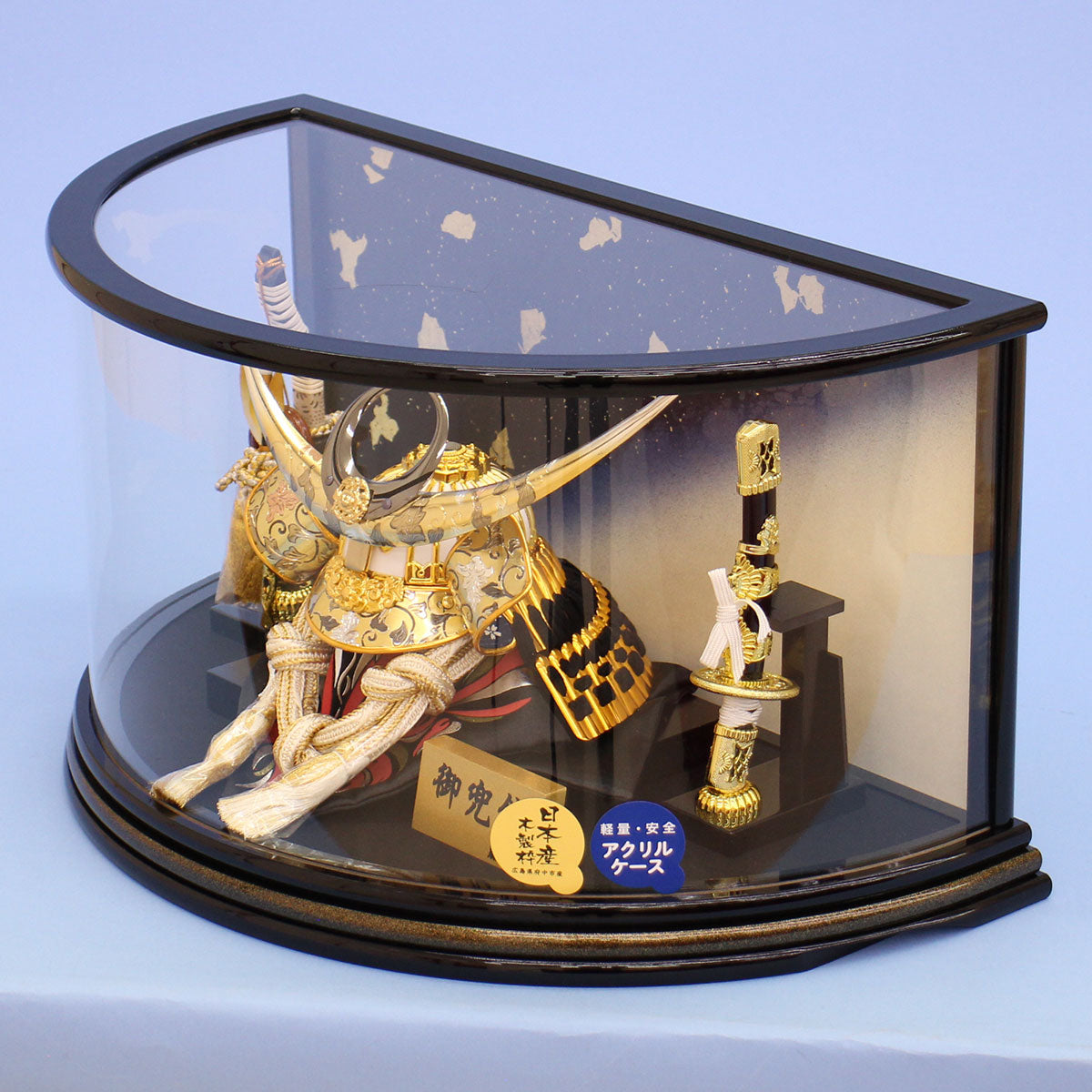- 带有刻有武田信玄兜壳的勇敢图案的半圆形全景亚克力人偶柜。