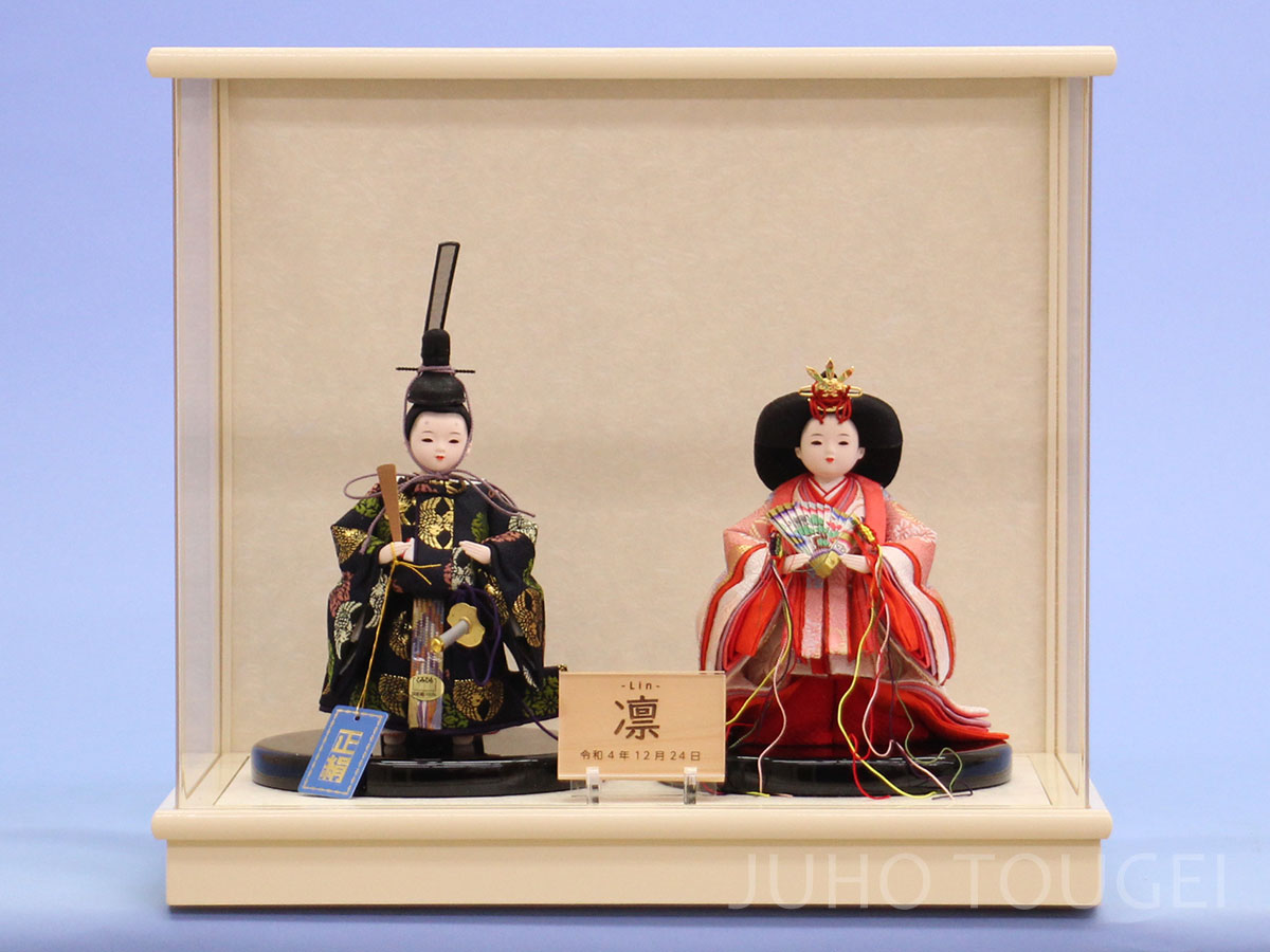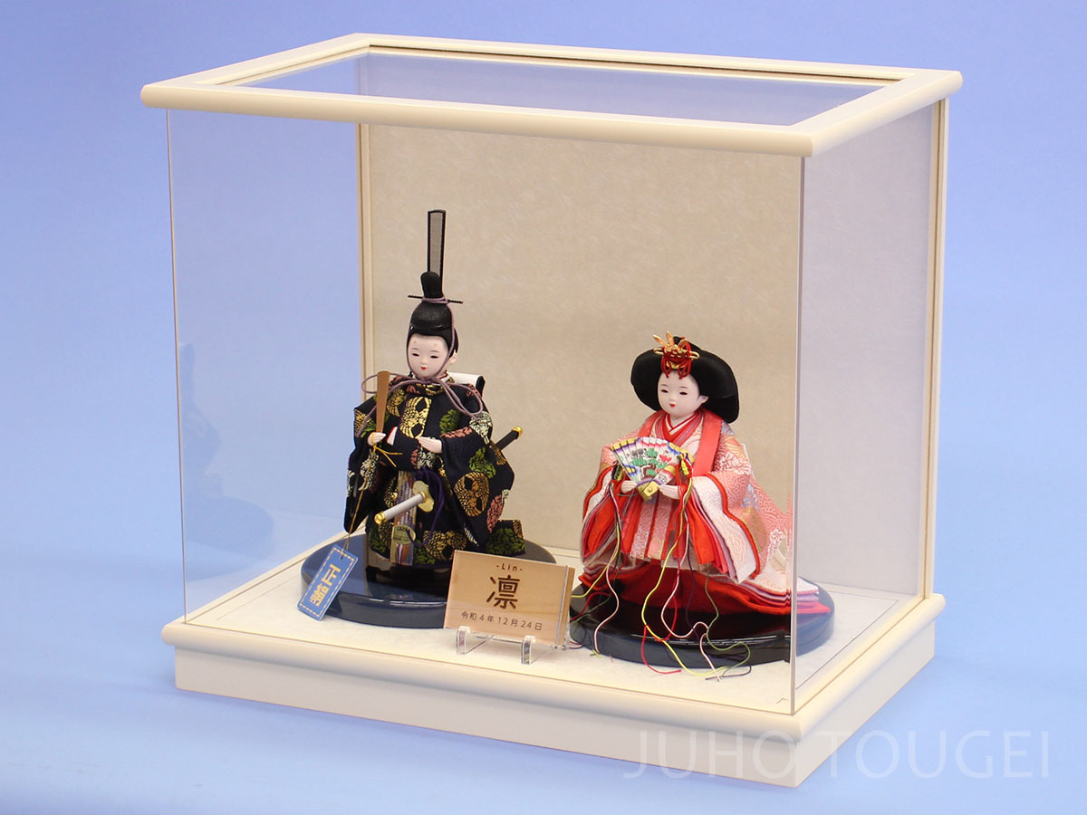- 推荐给想展示雏人偶同时又需要展示人偶柜的人士!可爱的藏青与红色雏人偶摆放于简约金色背板与黑色框架的亚克力人偶柜内。
