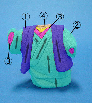 - 数字①至④为布料编号。底部和颈部使用绉纱布料。