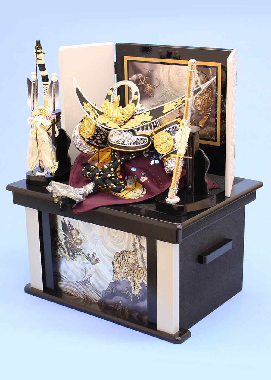 这是一个平式摆设的儿童节节人偶、盔甲、兜帽和小将军组合套装,由人偶专卖店推荐。该产品为一个储物兜帽套装,结合了带雕刻风装饰的华丽底座和屏风套装,以及一顶银质上杉谦信兜帽。虽然称为储物套装,但弓箭和刀剑的人偶柜无法放入底座中,请注意。