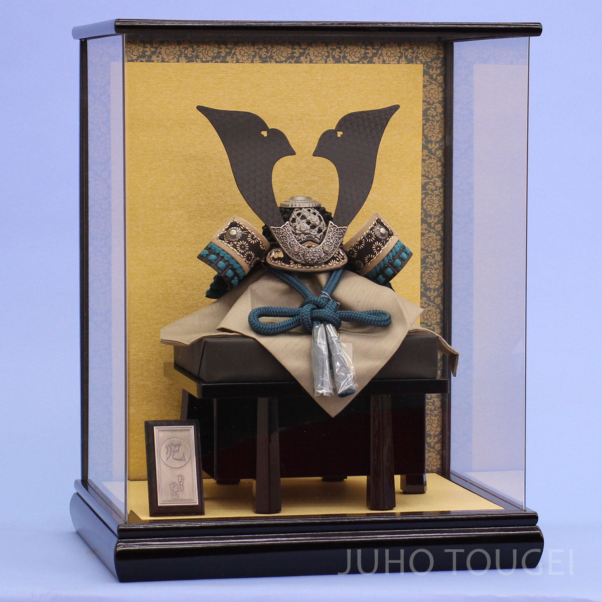 - 兜のケース飾りは、鈴甲子雄山の天賦の兜を、5号の黒塗櫃で飾った時のイメージです。