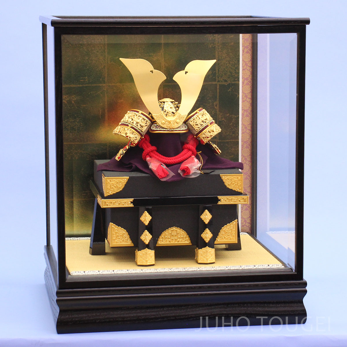 - 兜のケース飾りは一徳作の9号竹雀兜を9号金金具櫃で飾った時のイメージです