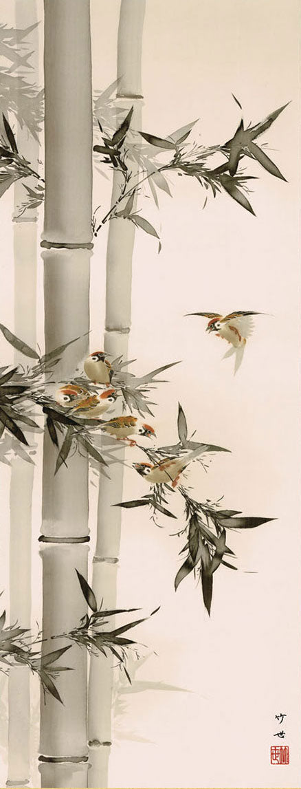 竹与麻雀的描绘,表达了自然中的和谐与平静。竹子象征其柔韧与生命力,麻雀则象征与自然的和谐,这一组合寓意与自然的协调与宁静。